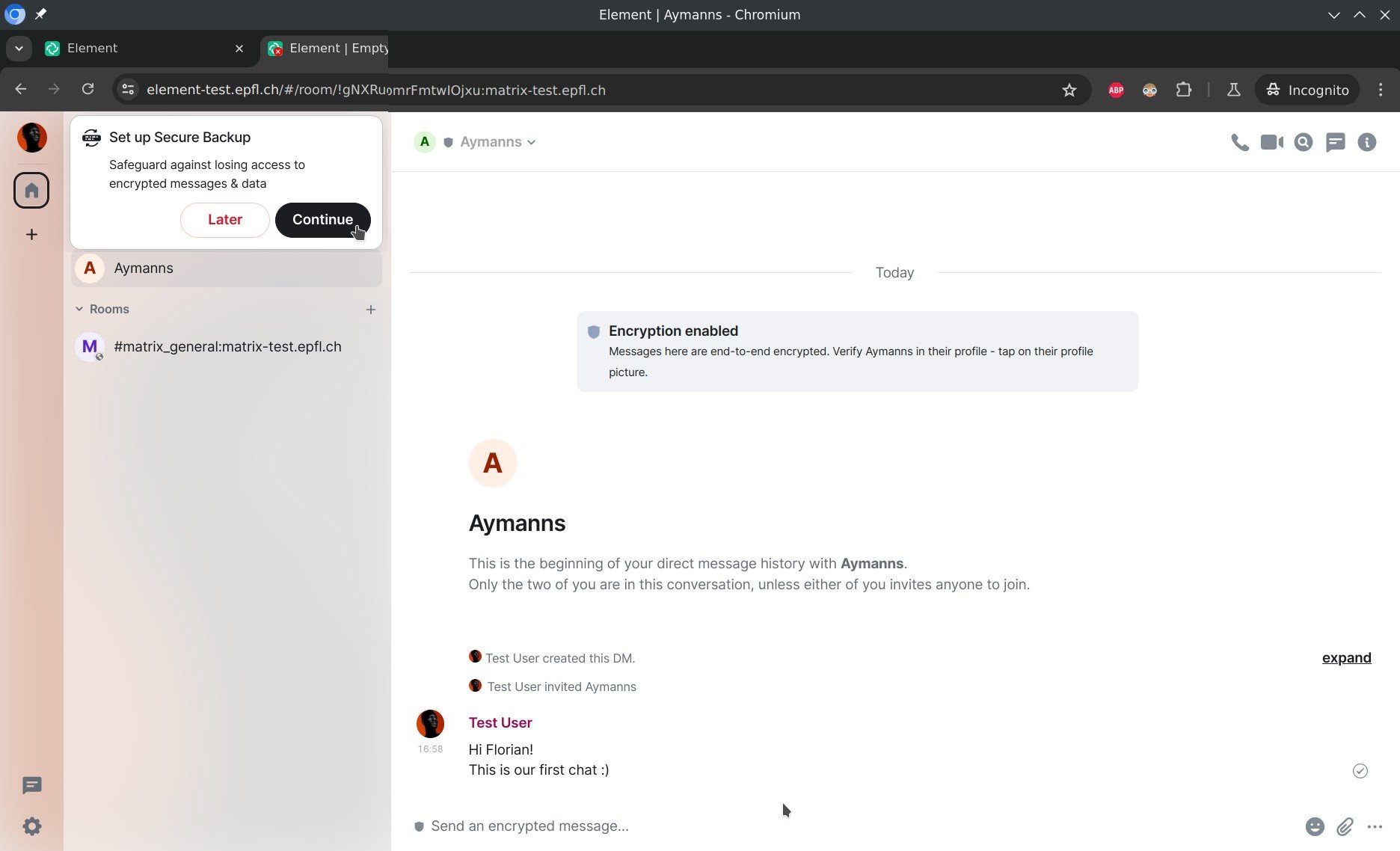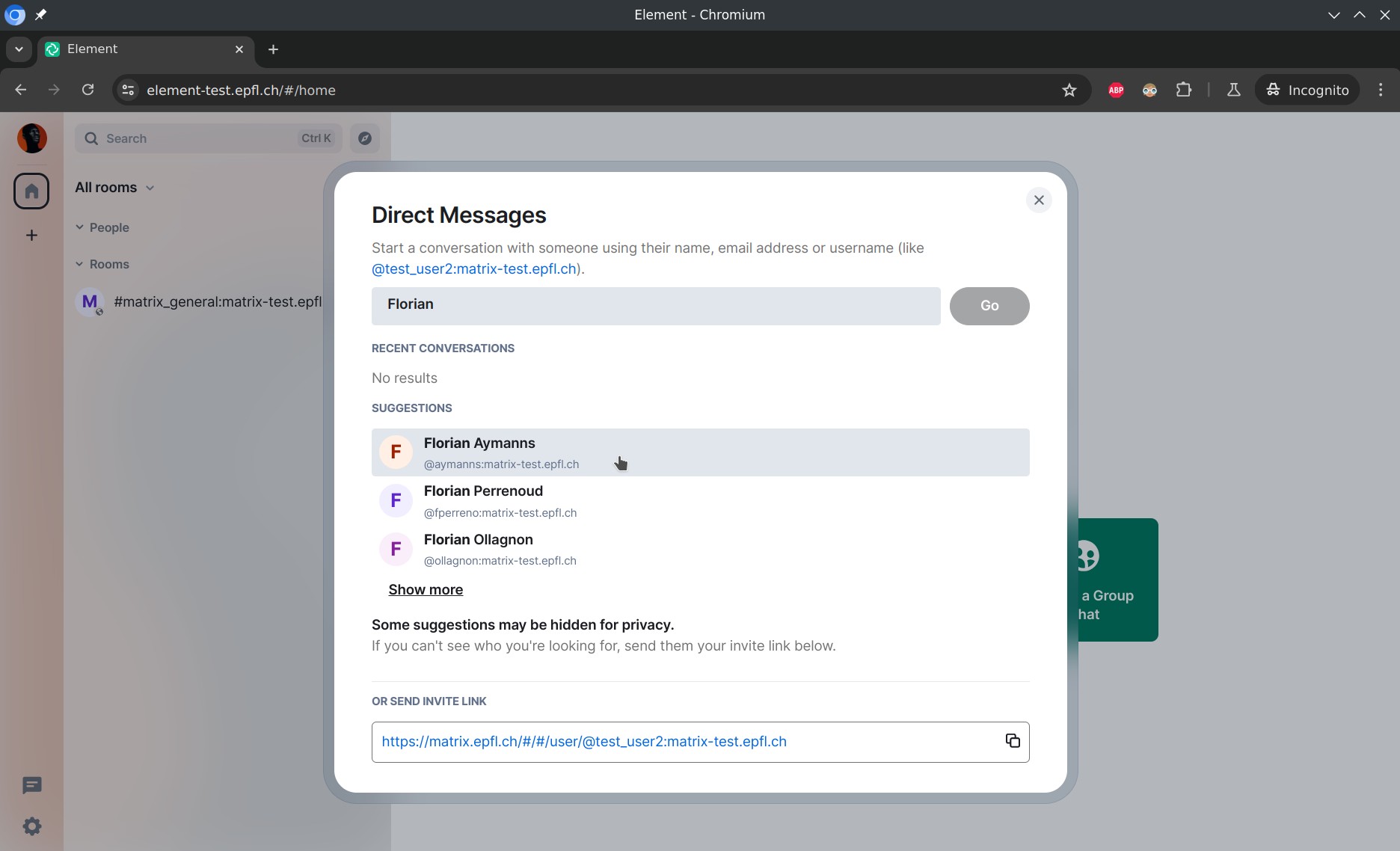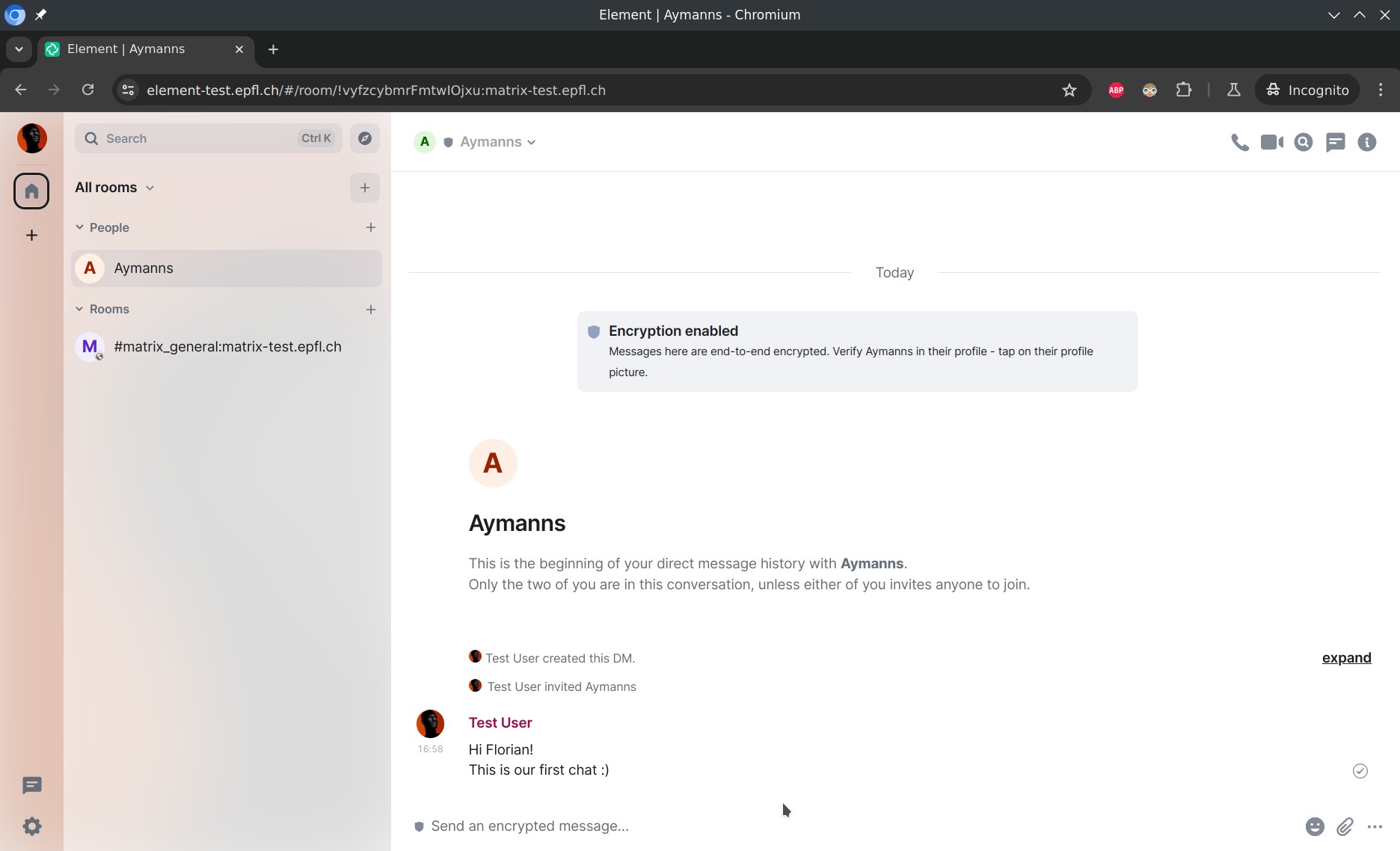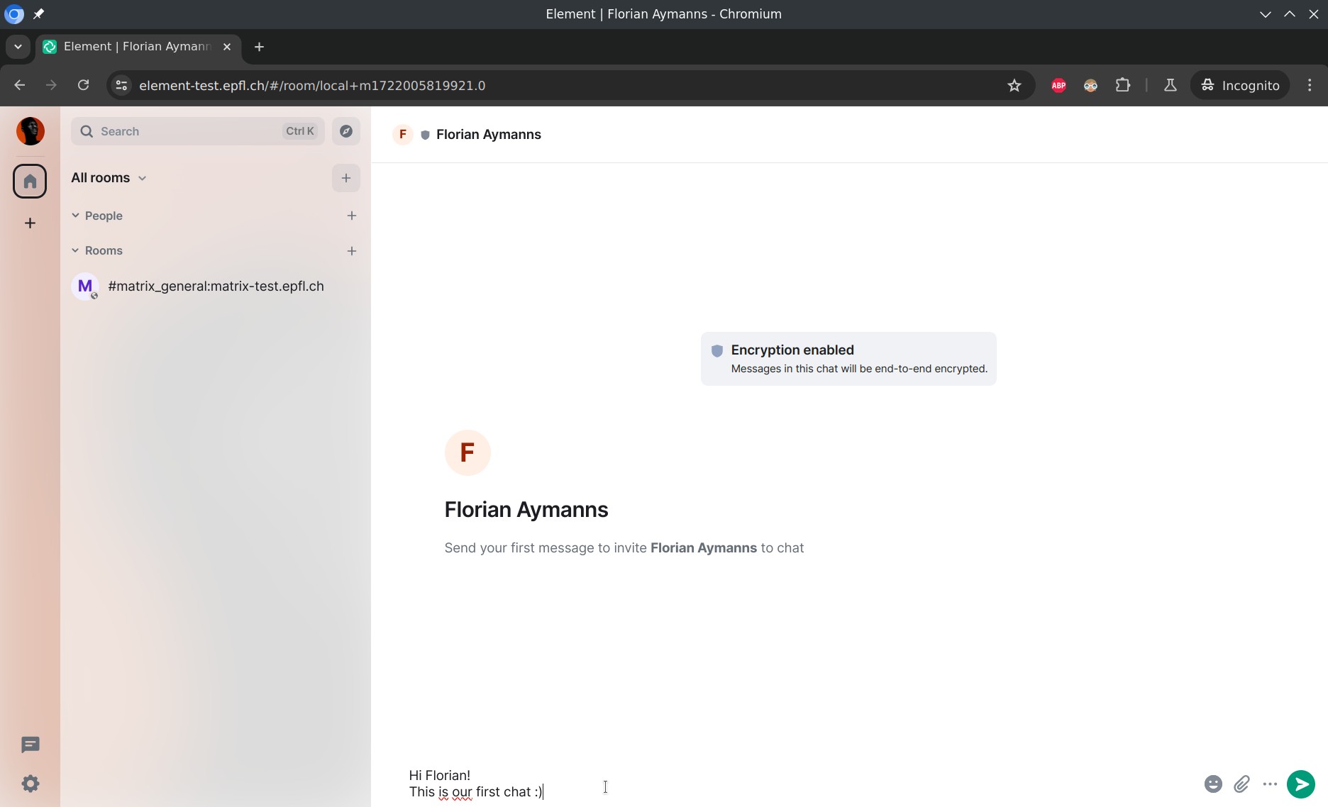 You will automatically join the "This Matrix Instance" room.Let's start a new direct message by clicking on "+ Start Chat" next to "People"