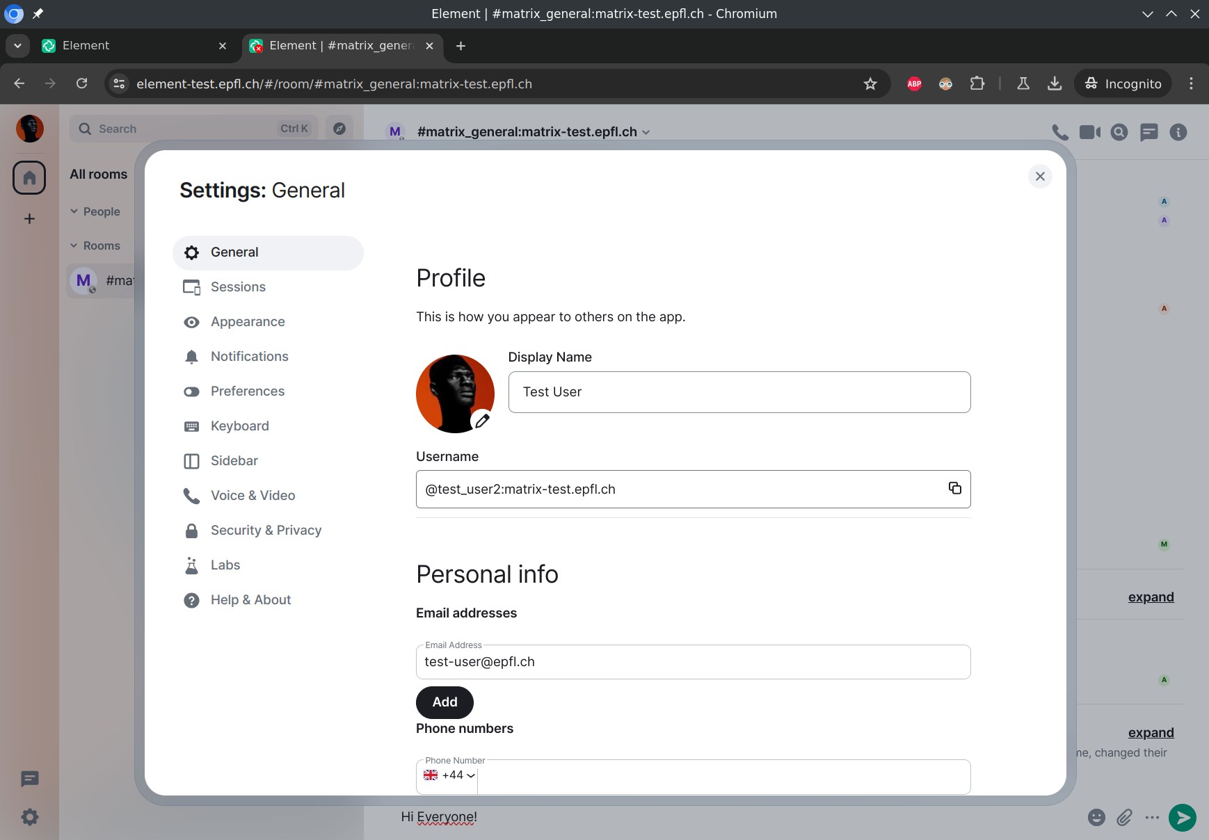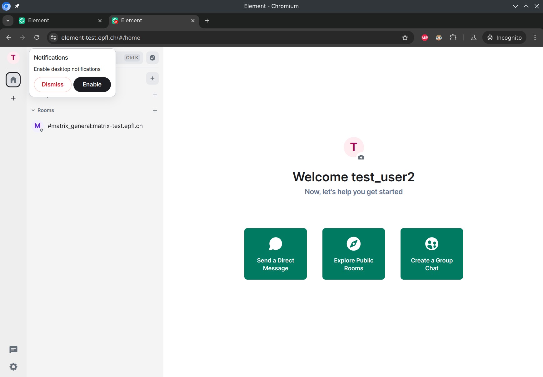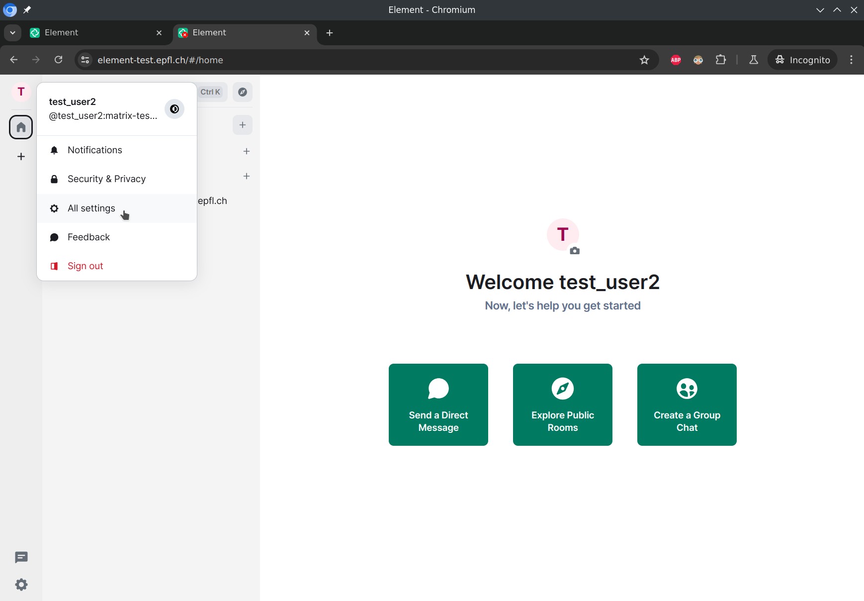 You will automatically join the "This Matrix Instance" room.Let's start a new direct message by clicking on "+ Start Chat" next to "People"