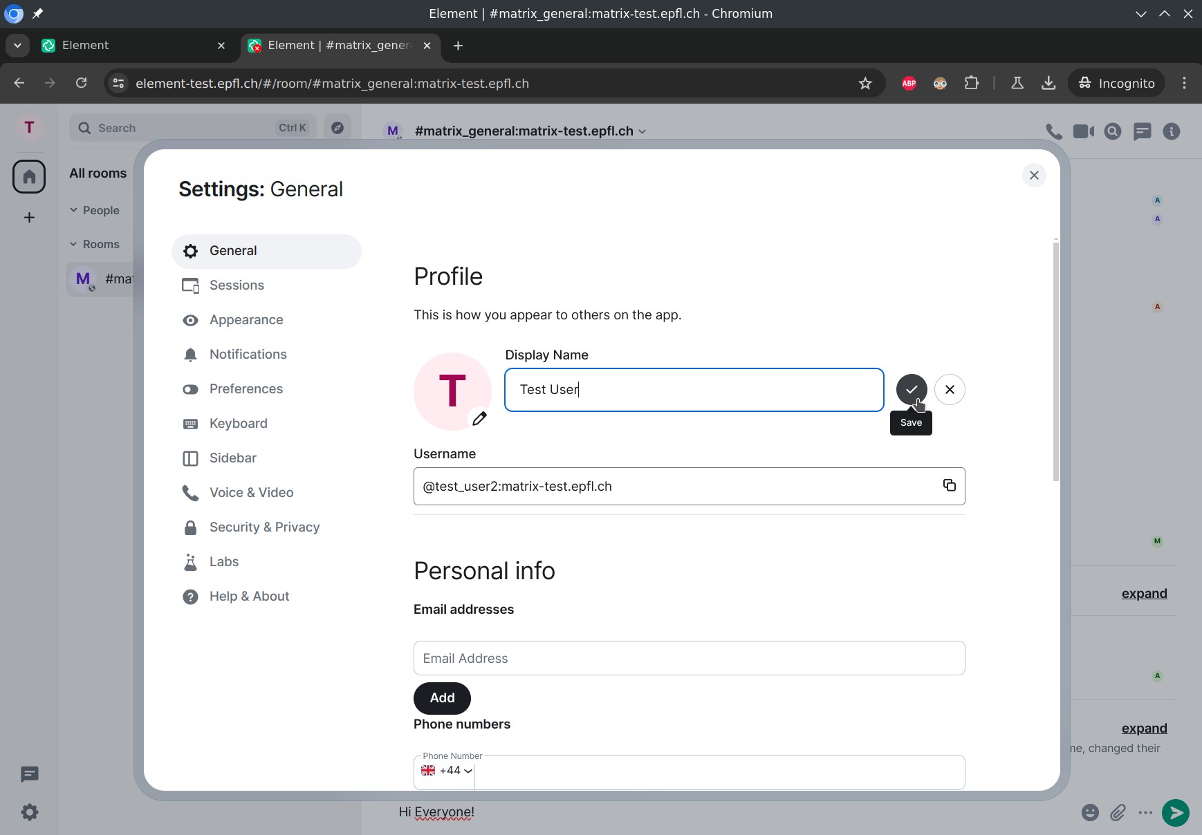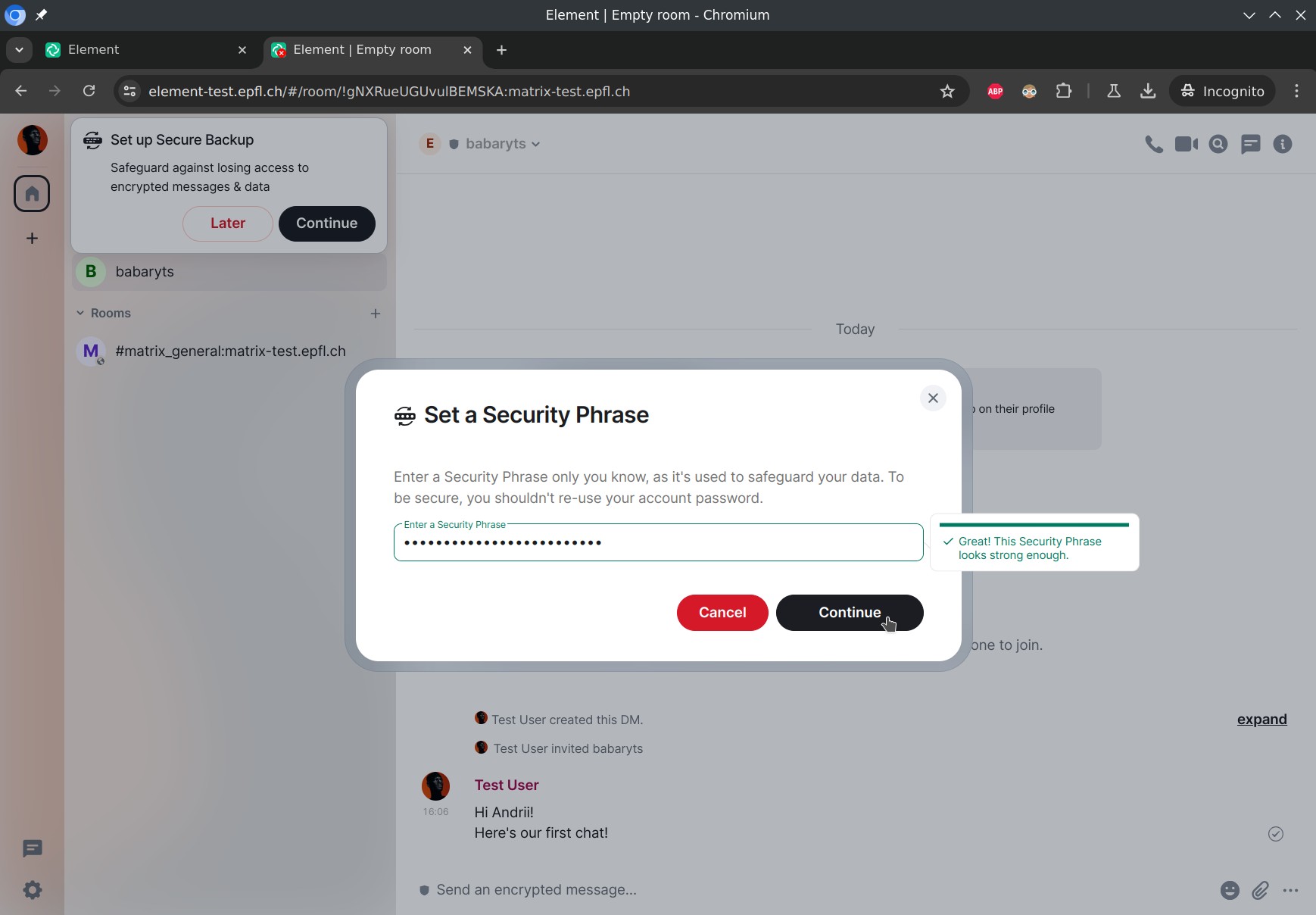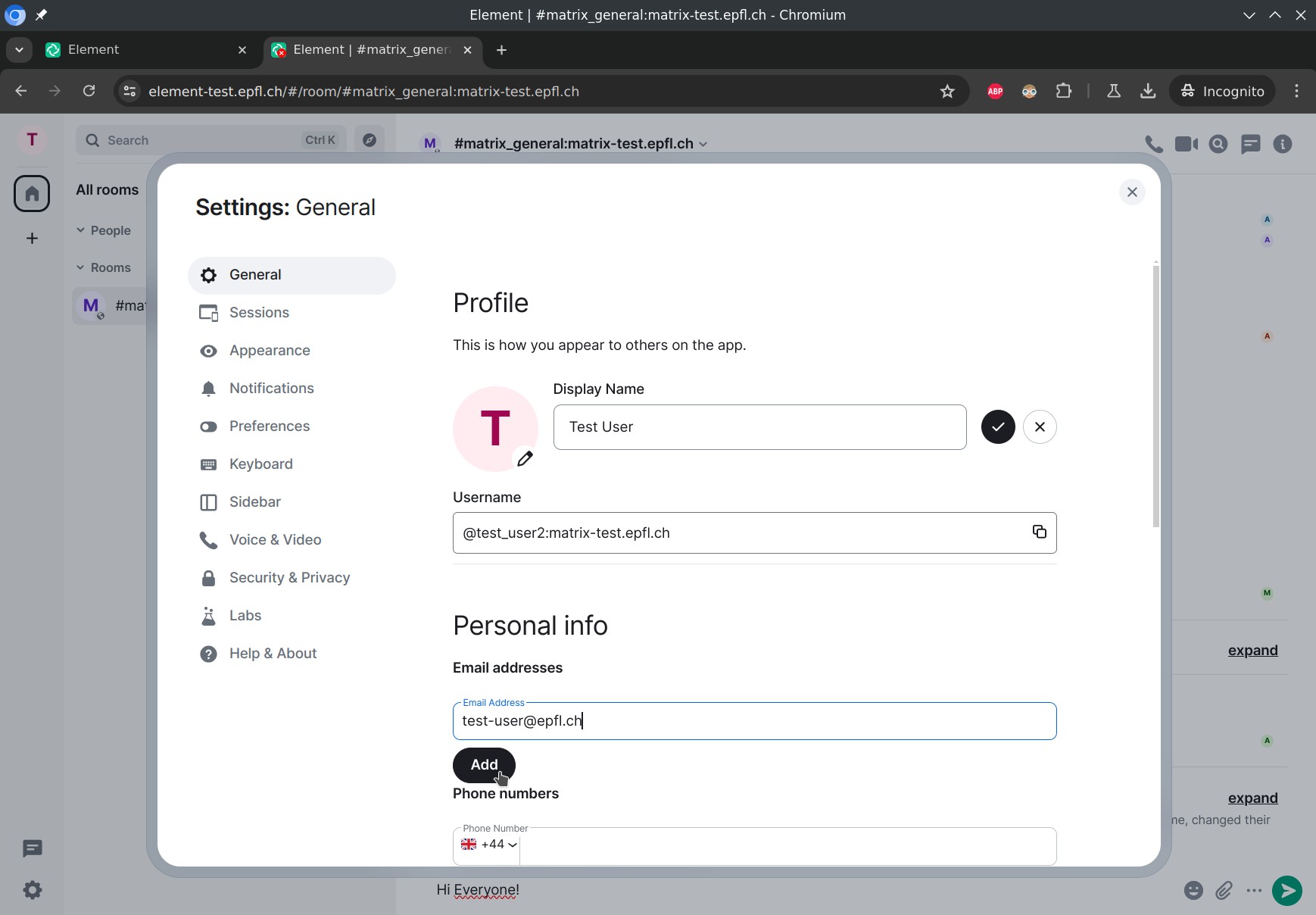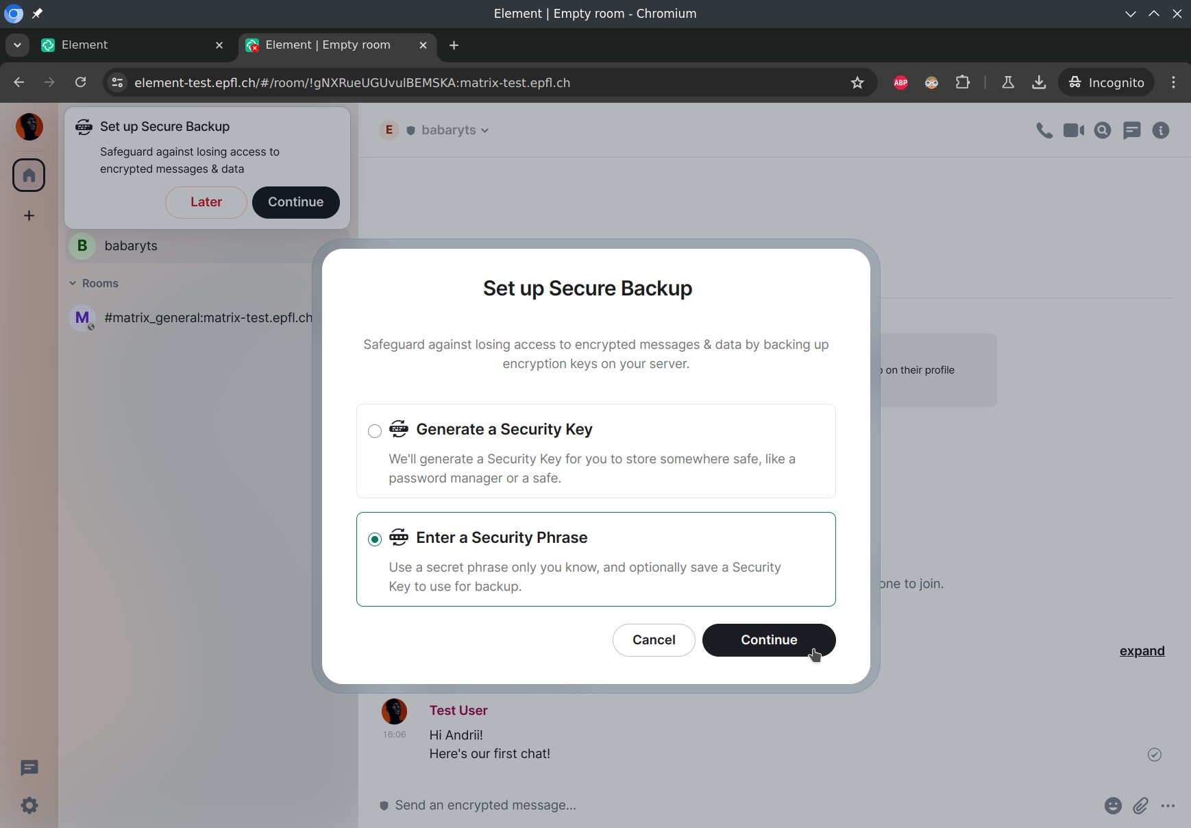 You will automatically join the "This Matrix Instance" room.Let's start a new direct message by clicking on "+ Start Chat" next to "People"